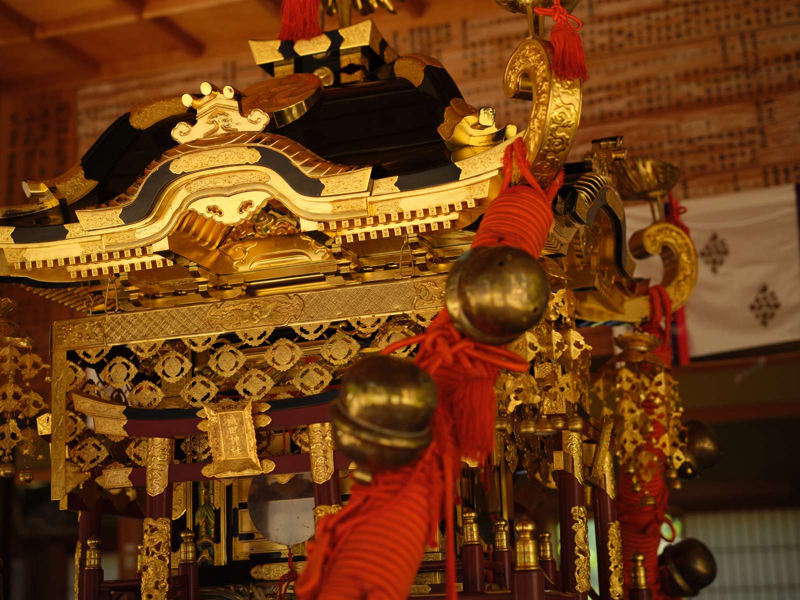 織田神社の能楽殿には立派な神輿が鎮座していた。平成9年に新調されたもので、煌びやかな装飾が目をひく。古い神輿の時は担ぎ手が酒の勢いで神輿の屋根に乗ったり倒したりすることも多く、「暴れ神輿」と呼ばれていたそうだ。容易にひっくり返すことができないよう重量を上げ、今の神輿の重さはなんと1t以上に及ぶ。